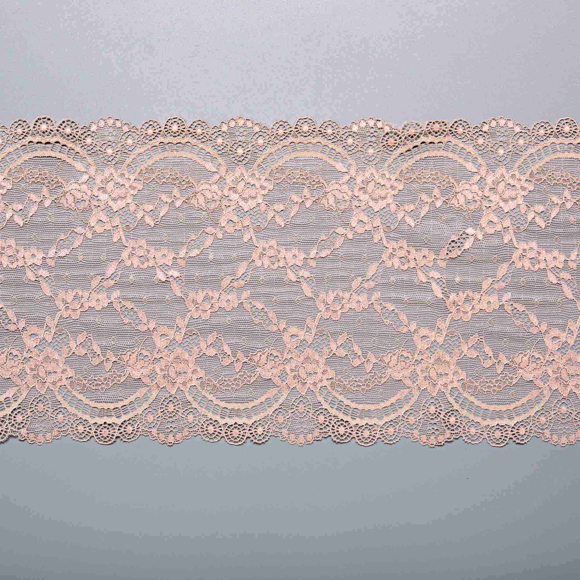 Эластичное кружево арт. H6085M (70.2% полиамид, 19.9% эластан, 9.9% полиэстер), плотность 20.1 г/м2, ширина 19.4 см, Китай. Эластичное кружево для белья для пошива нижнего белья, трусиков, бюстгальтеров. Китайское кружево стрейч с изящным узором доступно по цене. Купите эластичное кружево для белья оптом в WOStock.ru
